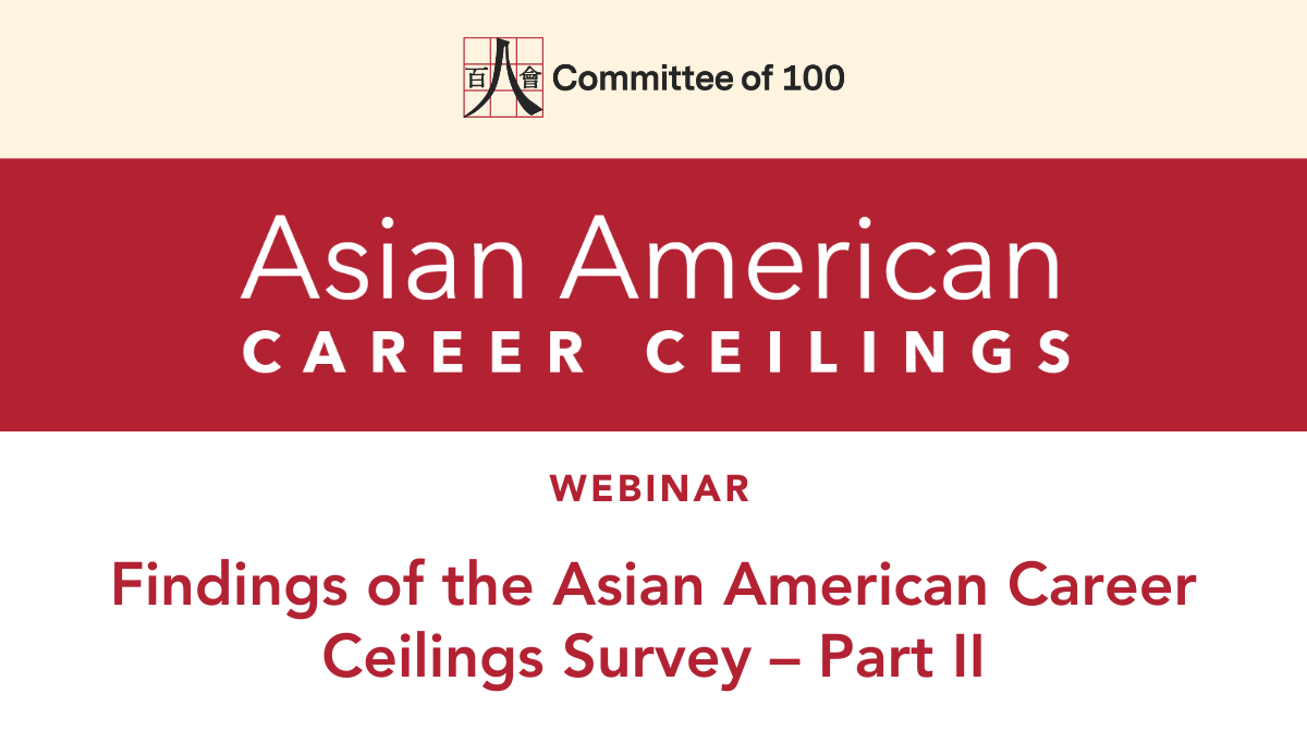 Join Committee of 100’s Asian American Career Ceilings Initiative for Part II of our two-part series on the Asian American Career Ceilings Survey. This session will cover detailed breakdowns by gender, age group, seniority, and profession. We will also highlight respondents’ perspectives on solutions that companies, government agencies, and other institutions can implement to address career obstacles faced by Asian Americans, along with examples of incidents they experience. Peter Young, Chair of the Asian American Career Ceilings Initiative and Committee of 100 Member, will lead a 30-minute presentation of the results, followed by a 15-minute audience Q&A.