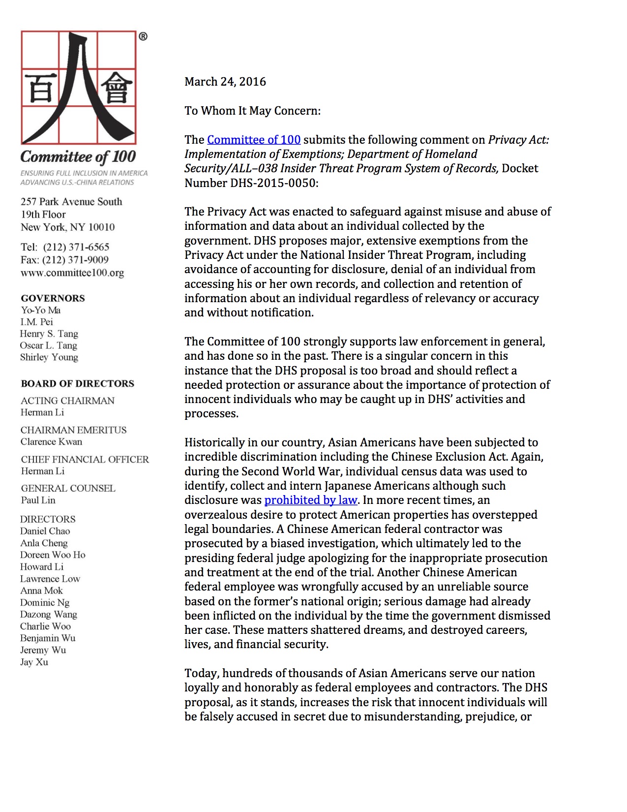 The comments submitted by the Committee of 100 state the following: